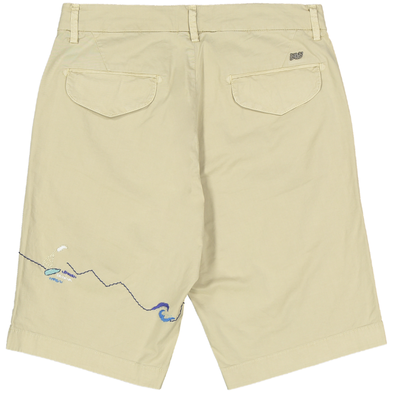 Pantaloni lunghezza sopra al ginocchio realizzati in leggero cotone elasticizzato, tasche laterali modello chino e tasche posteriori a filetto con aletta di chiusura. Ricami personalizzano il bermuda in perfetto stile Bob.