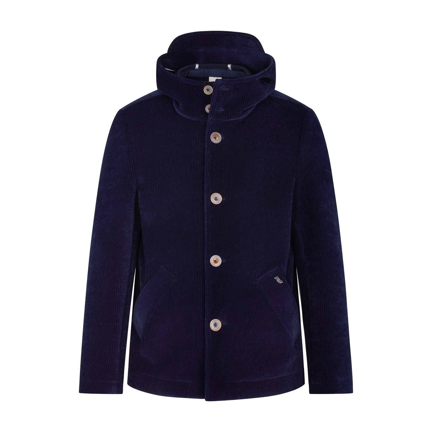 Giacca da esterno monopetto con cappuccio realizzata in velluto elasticizzato accoppiato ad una membrana di neoprene. Il materiale multistrato conferisce al capo calore e comfort. Allacciatura centrale con bottoni e zip, tasche oblique a filo scalda mano.