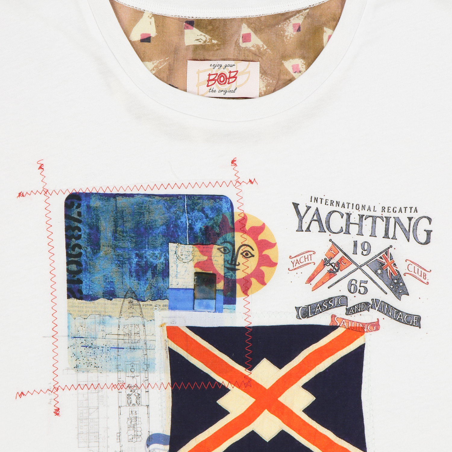 Maglietta mezza manica girocollo realizzata in cotone con stampa e applicazioni. Inserti nella mezza luna del collo stampa in stile Bob.