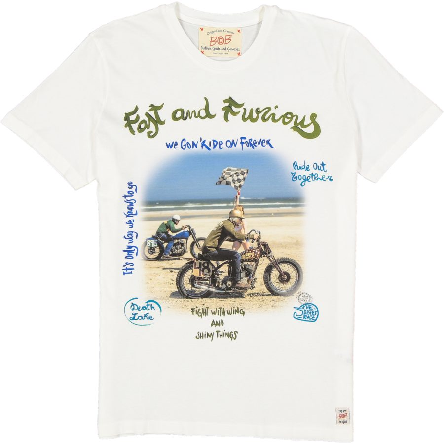 Maglietta mezza manica girocollo con stampa centrale e applicazioni in stile Bob.