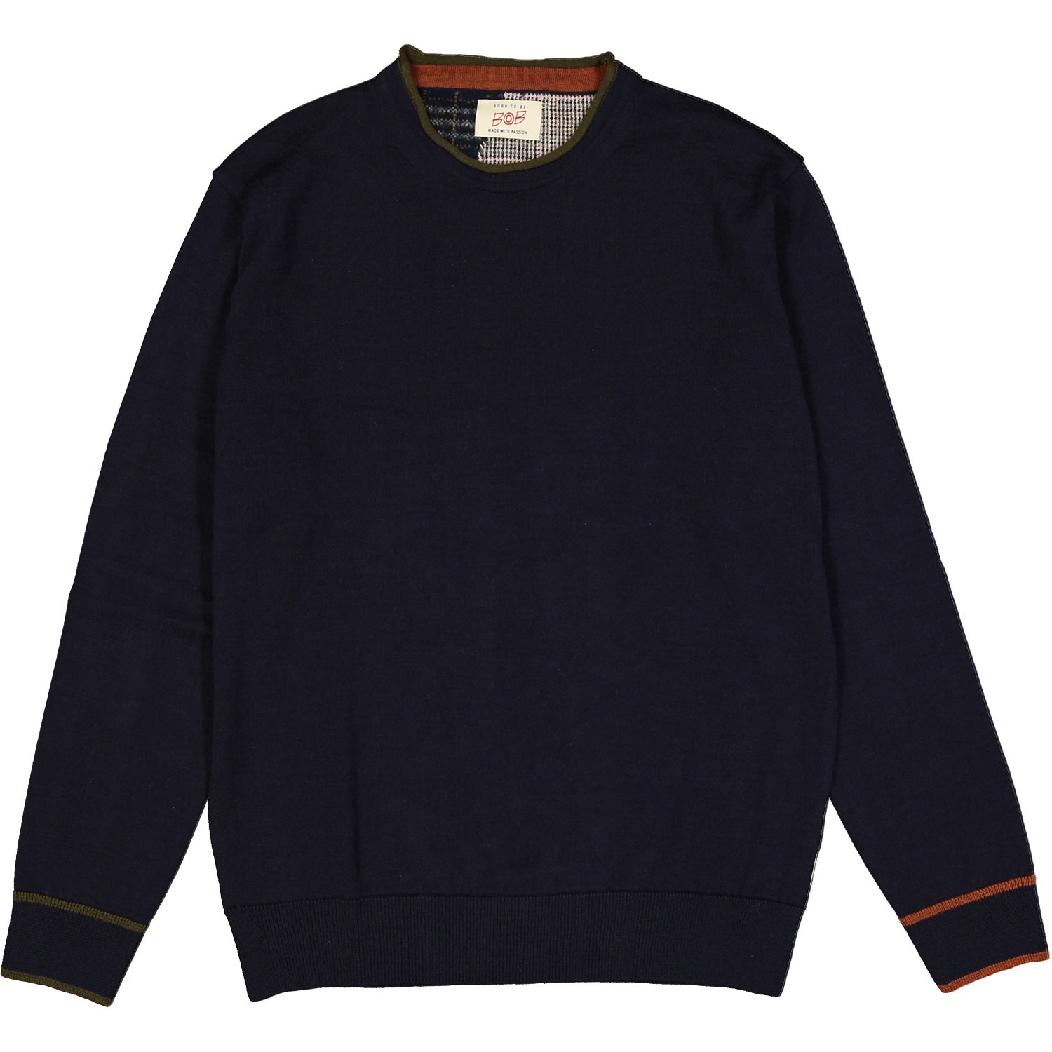 Maglione girocollo peso medio realizzato in misto lana. Bordino del collo, del fondo e dei polsini a contrasto, toppe in lavorazione alle maniche e mezzaluna interno collo con lavorazione jacquard in stile Bob.