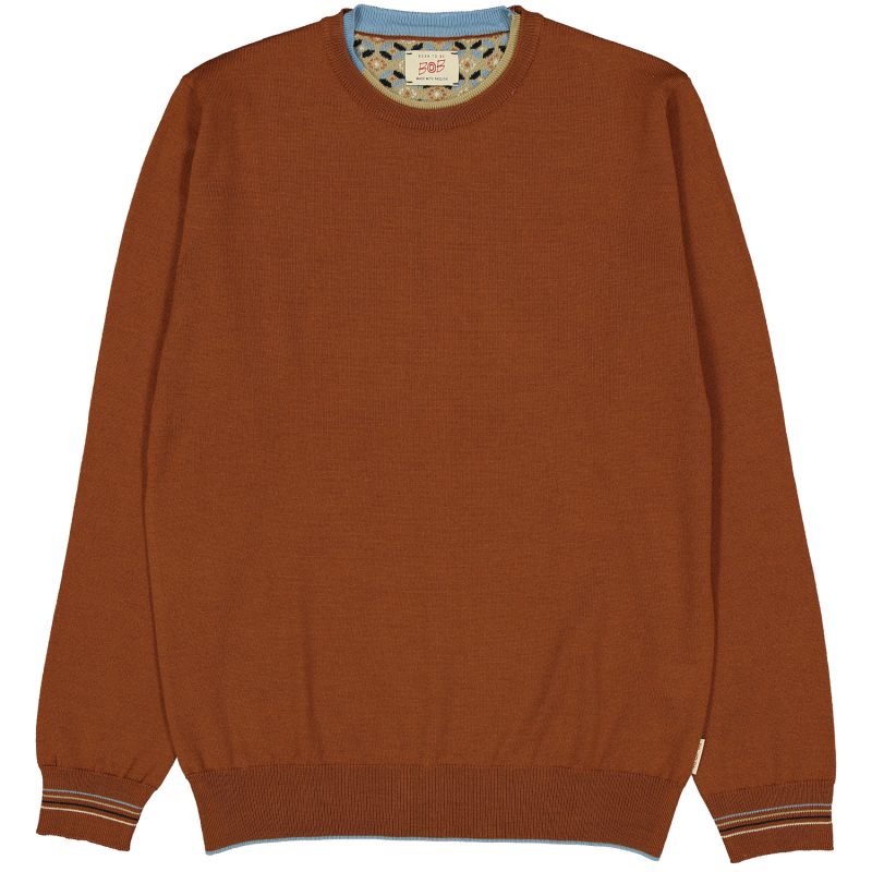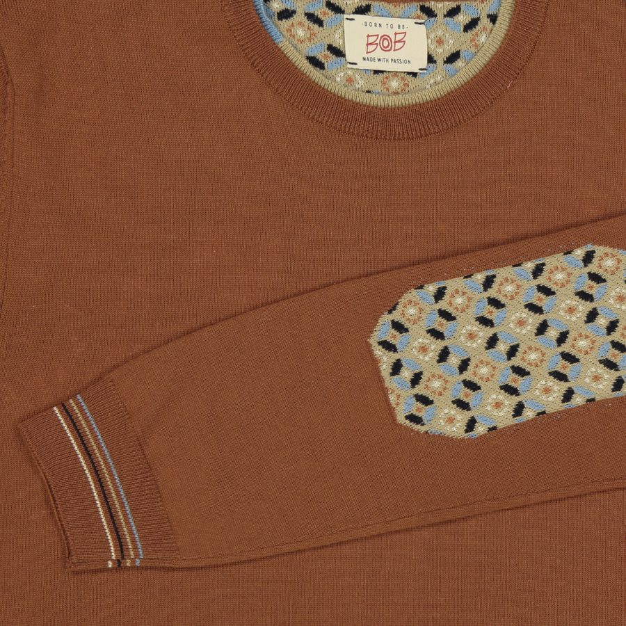 Maglione girocollo peso medio realizzato in misto lana. Bordino del collo, del fondo e dei polsini a contrasto, toppe applicate alle maniche e mezzaluna interno collo con lavorazione jacquard in stile Bob.