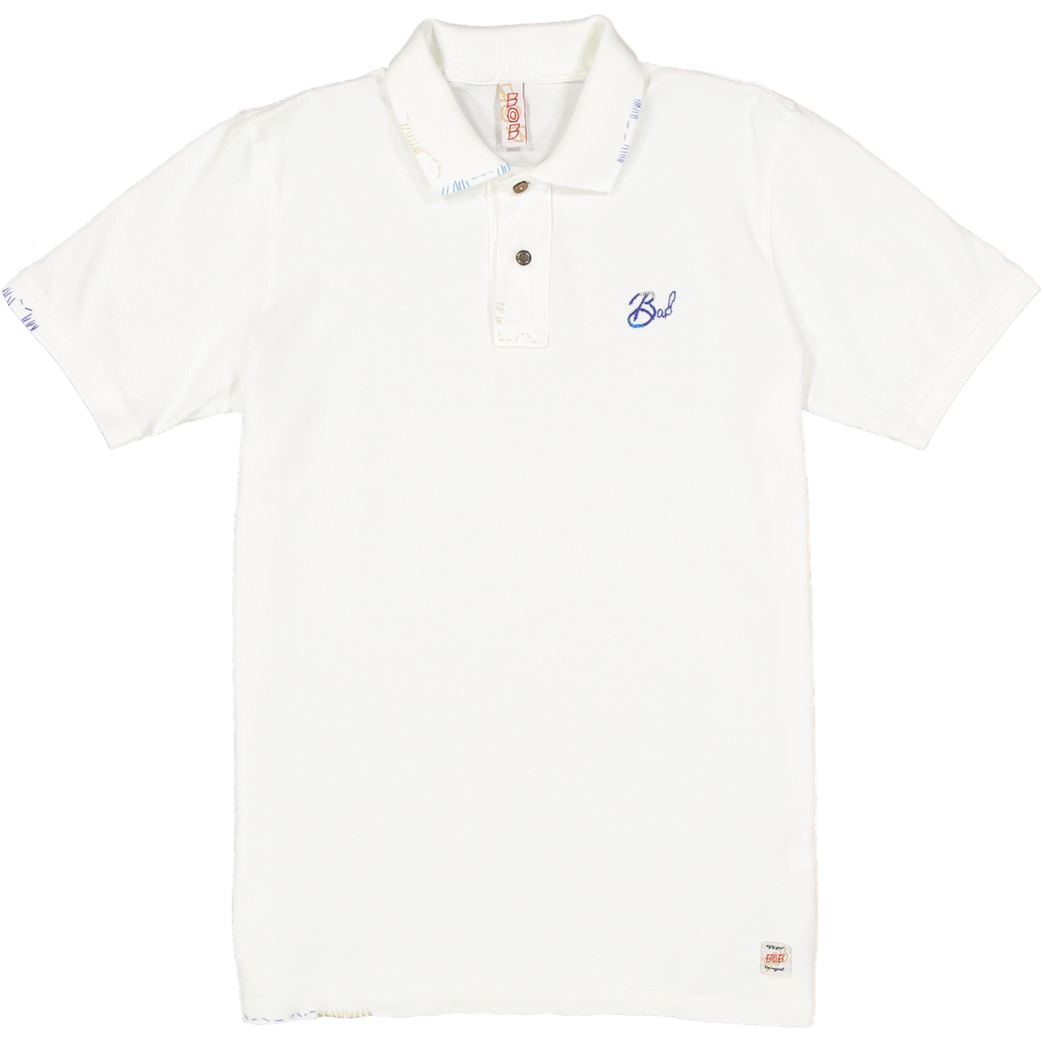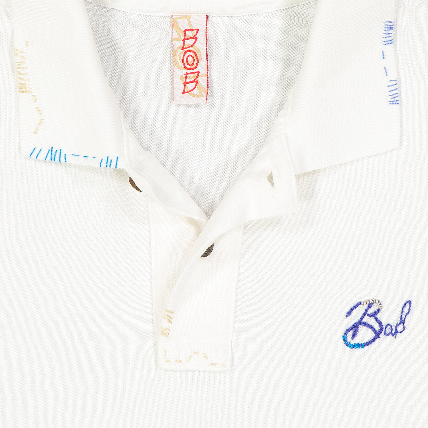 Polo 3 bottoncini mezza manica realizzata in cotone piquet dal peso leggero con ricami, applicazioni e impunture realizzate a mano in stile Bob.