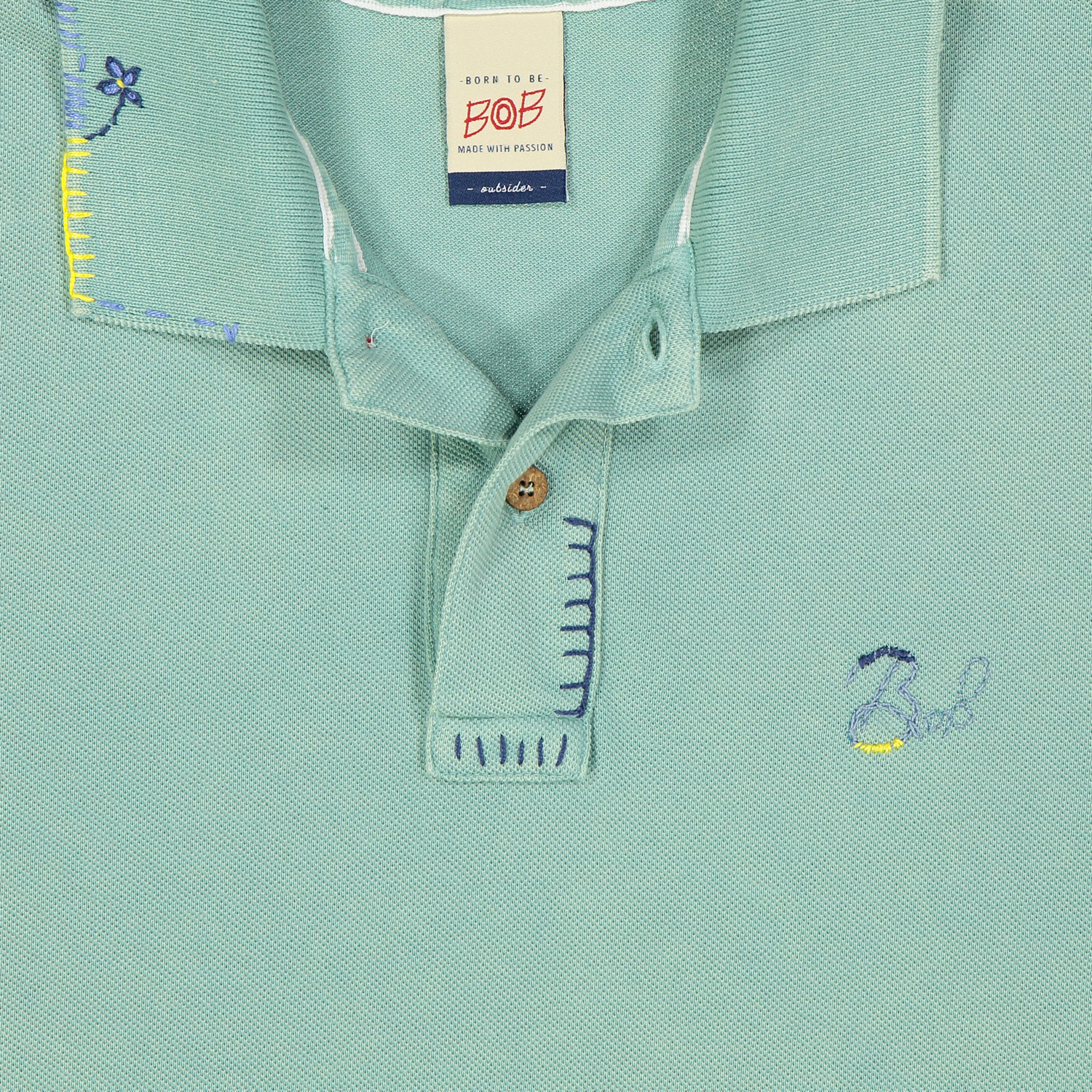 Polo 3 bottoncini mezza manica realizzata in cotone piquet dal peso leggero con ricami, applicazioni e impunture realizzate a mano in stile Bob.