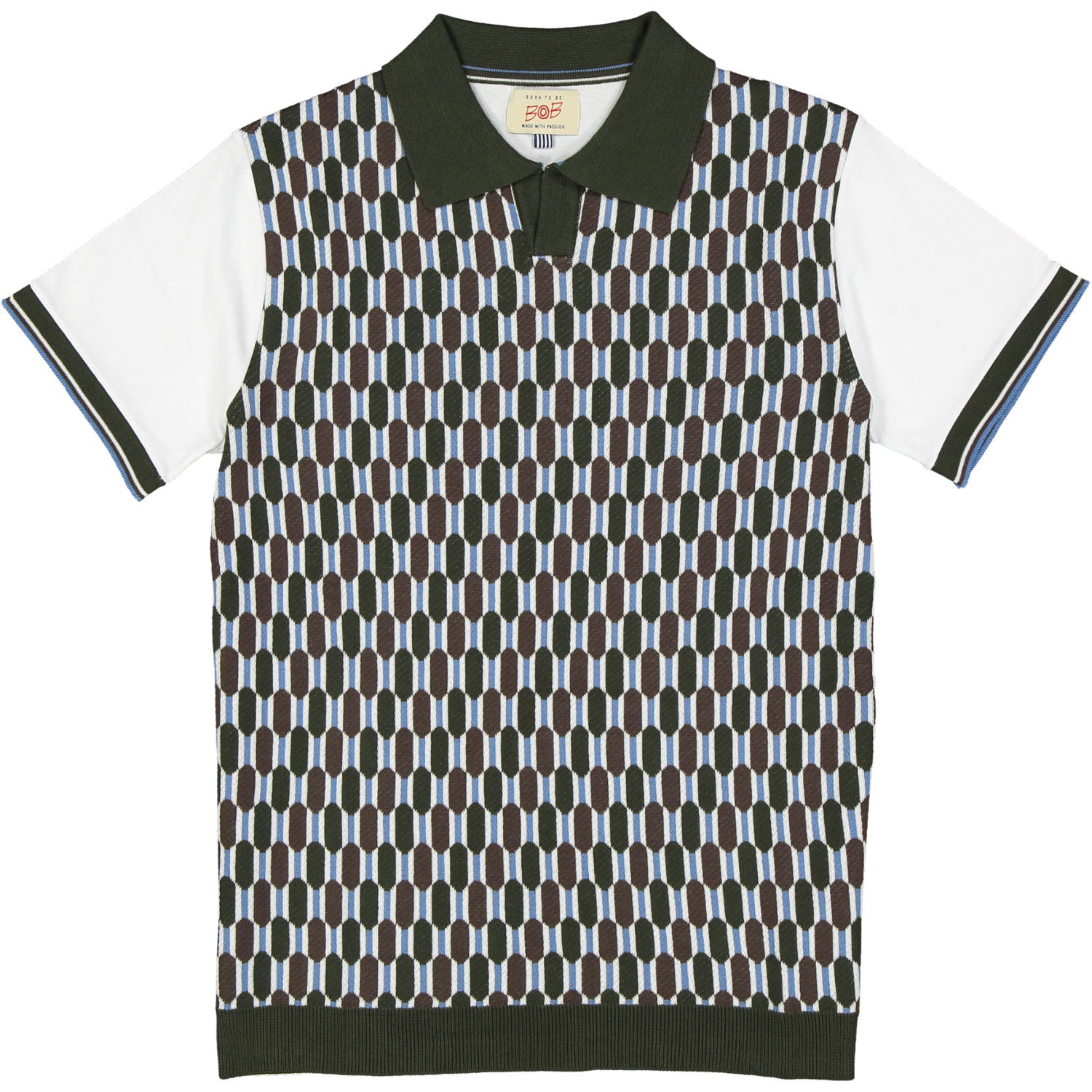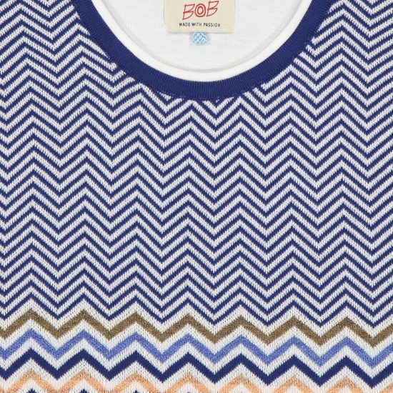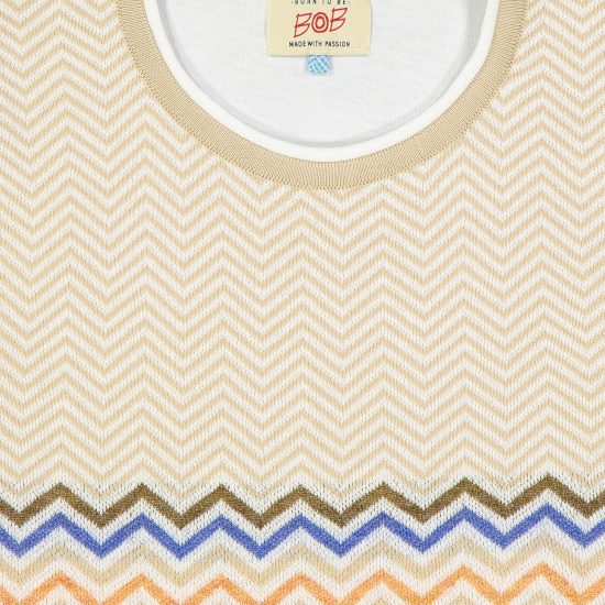 Polo mezza manica realizzata in filo di cotone. Corpo effetto maglia geometrico in stile Bob, maniche e schiena realizzate in morbido jersey di cotone bianco.