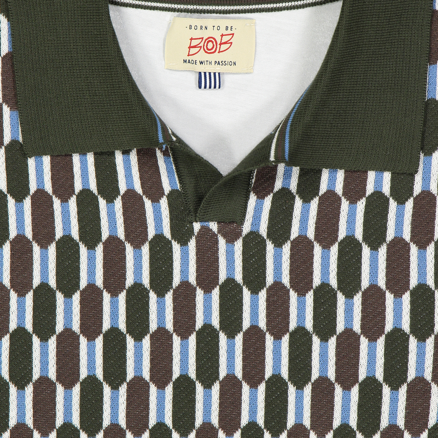COLORE: fondo con lavorazione geometrica verde, marrone e tocchi di azzurro; colletto verde