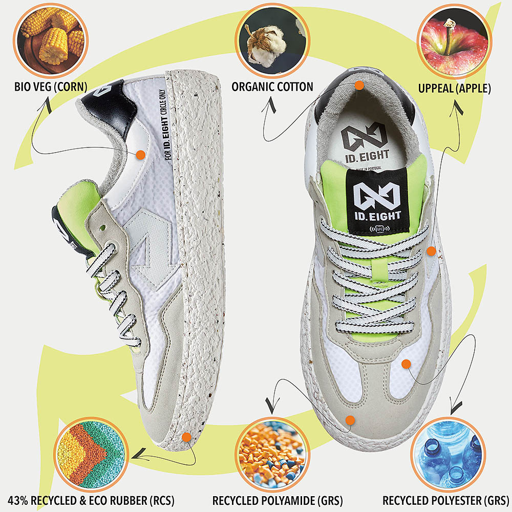 - Tomaia: 54% poliestere riciclato idrorepellente (GRS) + 29% poliammide riciclata (GRS) + 12% Uppeal (mela) + 5% BioVeg (mais)