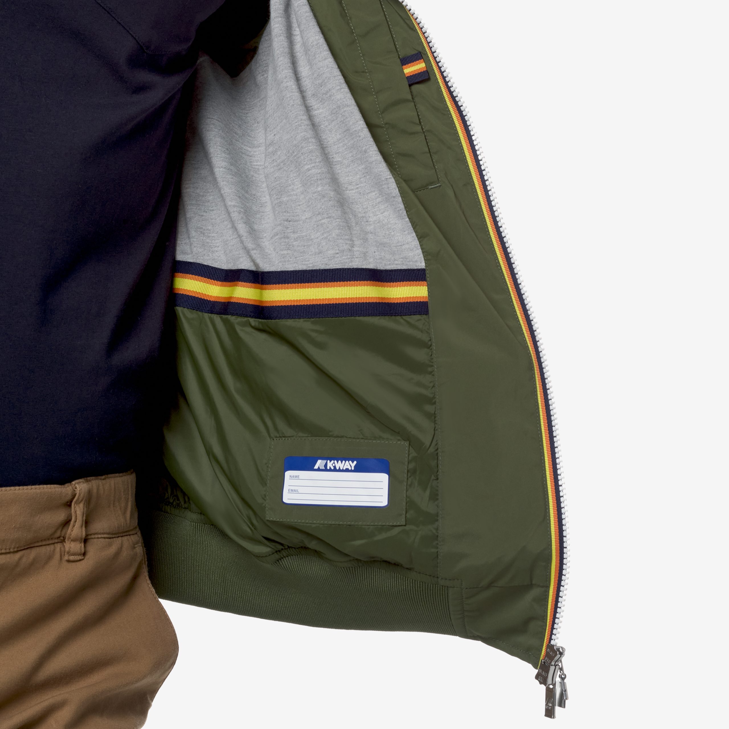 Giubbino corto modello Amaury realizzato in  nylon elasticizzato impermeabile, antivento, traspirante e rifinito con fodera in morbido jersey grigio melange solo su fronte e retro che garantisce massimo comfort, protezione e una sensazione piacevole. L’interno è rifinito con la massima cura dei dettagli: le cuciture sono termonastrate e al punto vita è presente l’iconico tape multicolor K-Way per una nota distintiva e di carattere. Altre caratteristiche sono: cappuccio ripiegato nel collo, chiusura con zip; polsi e bordo fondo in costina; 2 tasche con zip, taglio di ventilazione sul dietro; logo applicato gommato di colore bianco.