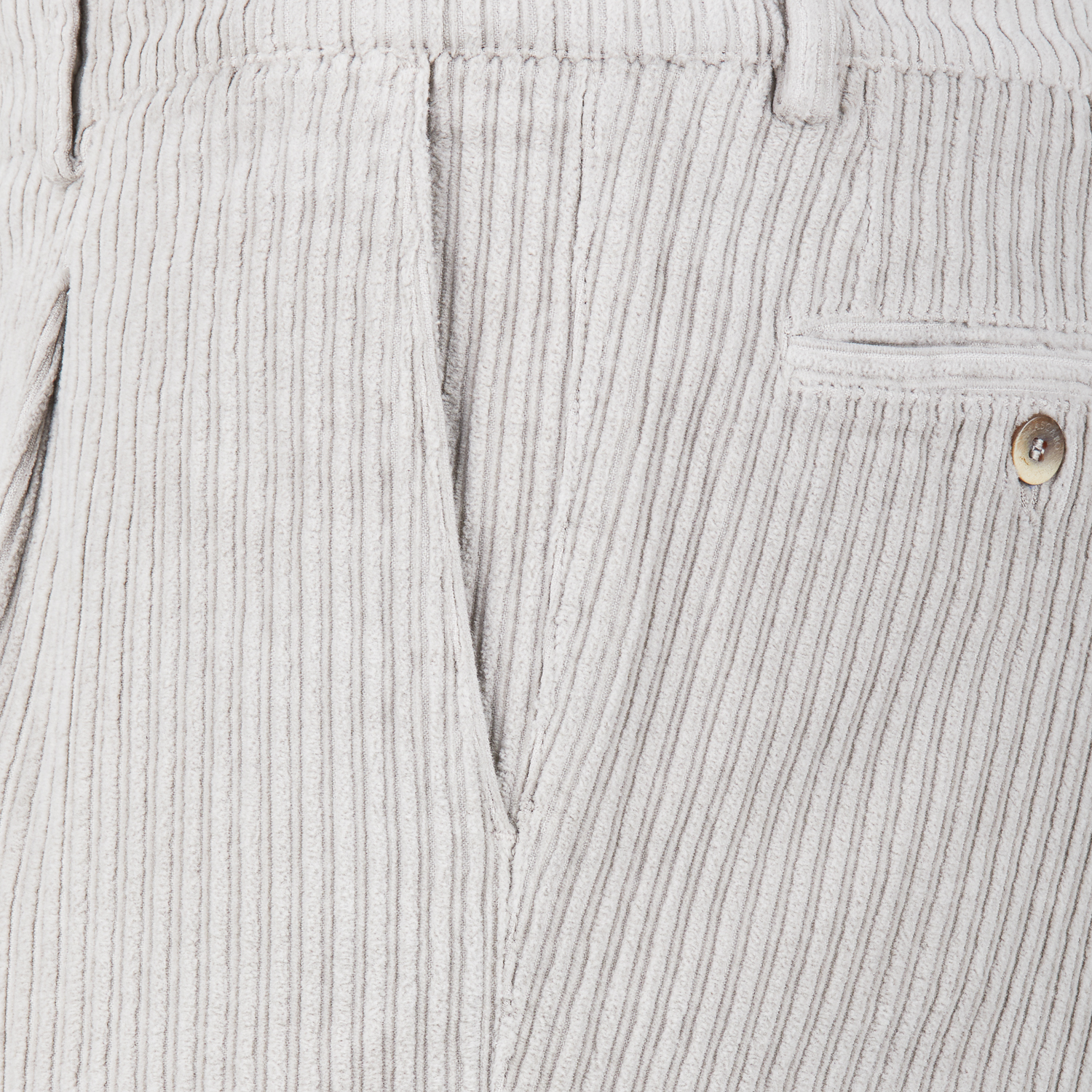 Pantalone uomo dalla vestibilità asciutta con pence singola realizzato in velluto di cotone leggermente elasticizzato effetto rocciatore con alternanza di righe strette e larghe. Chiusura centrale con bottone e zip, tasche anteriori taglio america, tasche posteriori a filetto con bottone di chiusura. Asole e dettagli con filo in tinta, bottoni a contrasto, interni realizzati in cotone micro fantasia stampa cravatta. Larghezza fondo 18 cm. Il capo ha subito dopo la confezione un lavaggio enzimatico a pietre per conferire al pantalone un aspetto leggermente vissuto.