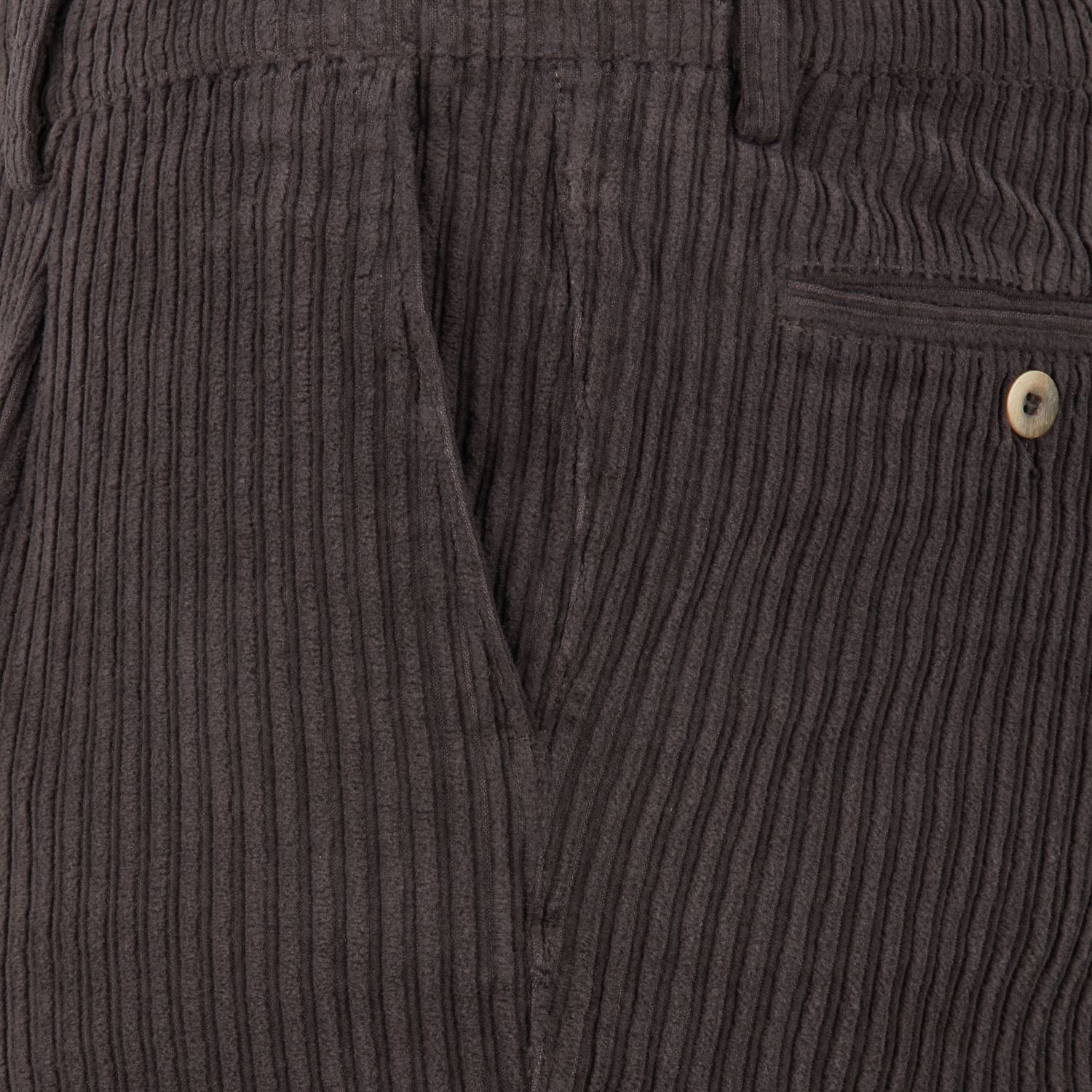Pantalone uomo dalla vestibilità asciutta con pence singola realizzato in velluto di cotone leggermente elasticizzato effetto rocciatore con alternanza di righe strette e larghe. Chiusura centrale con bottone e zip, tasche anteriori taglio america, tasche posteriori a filetto con bottone di chiusura. Asole e dettagli con filo in tinta, bottoni a contrasto, interni realizzati in cotone micro fantasia stampa cravatta. Larghezza fondo 18 cm. Il capo ha subito dopo la confezione un lavaggio enzimatico a pietre per conferire al pantalone un aspetto leggermente vissuto.