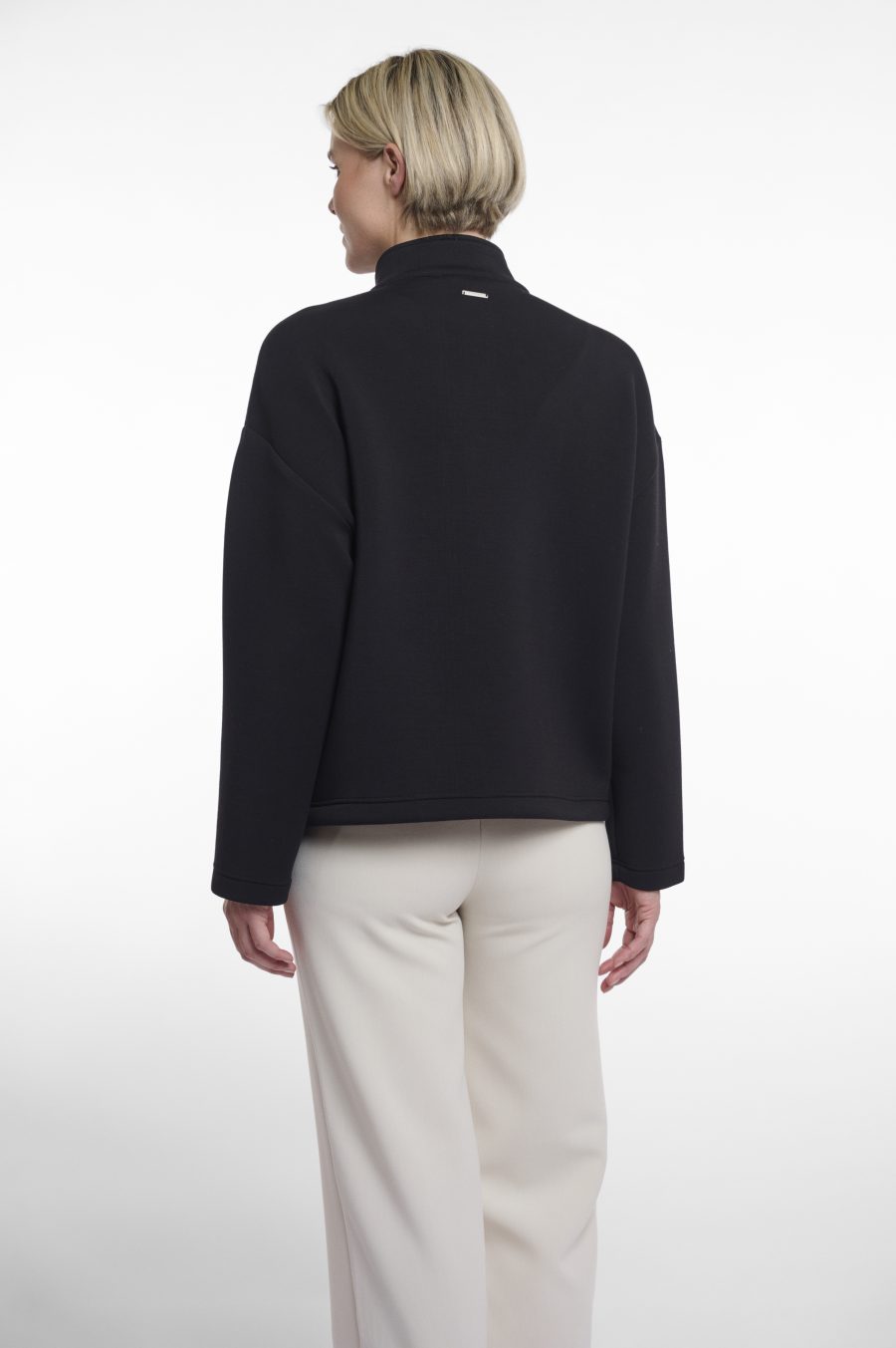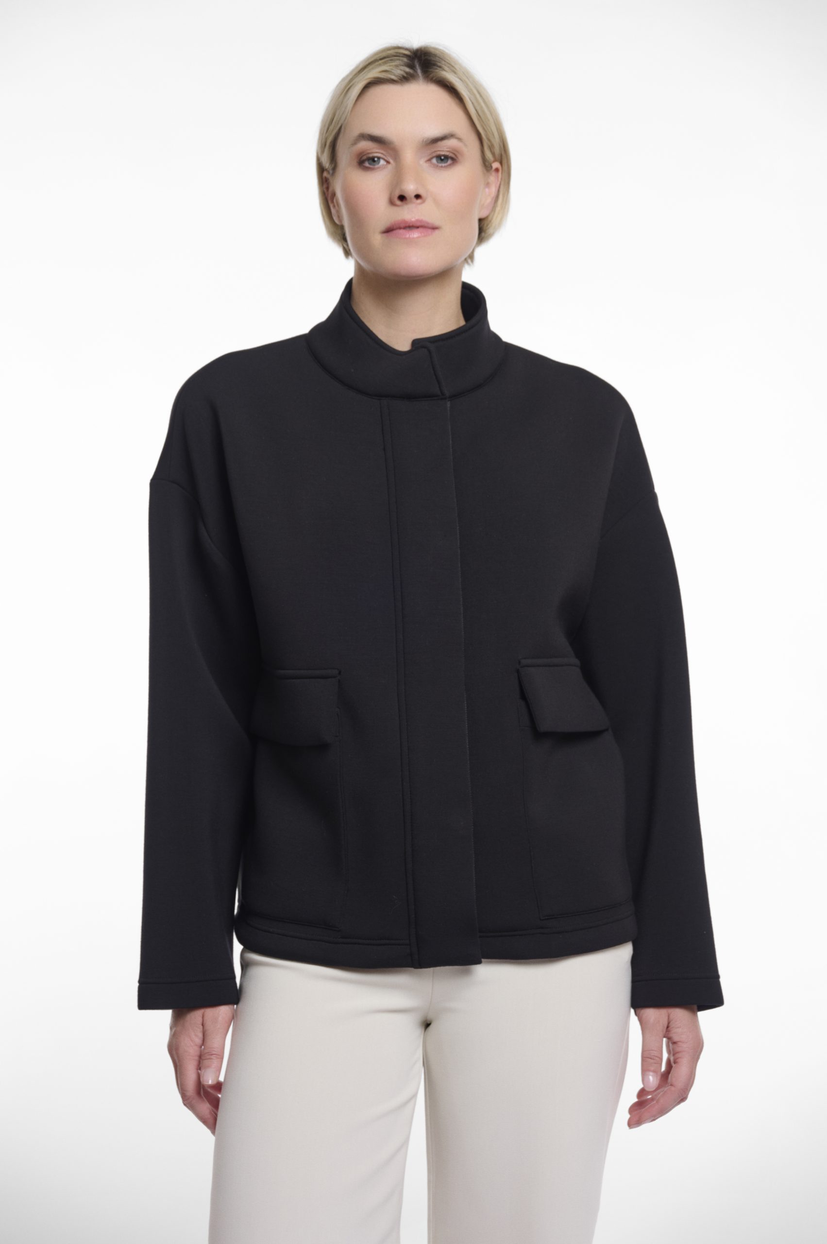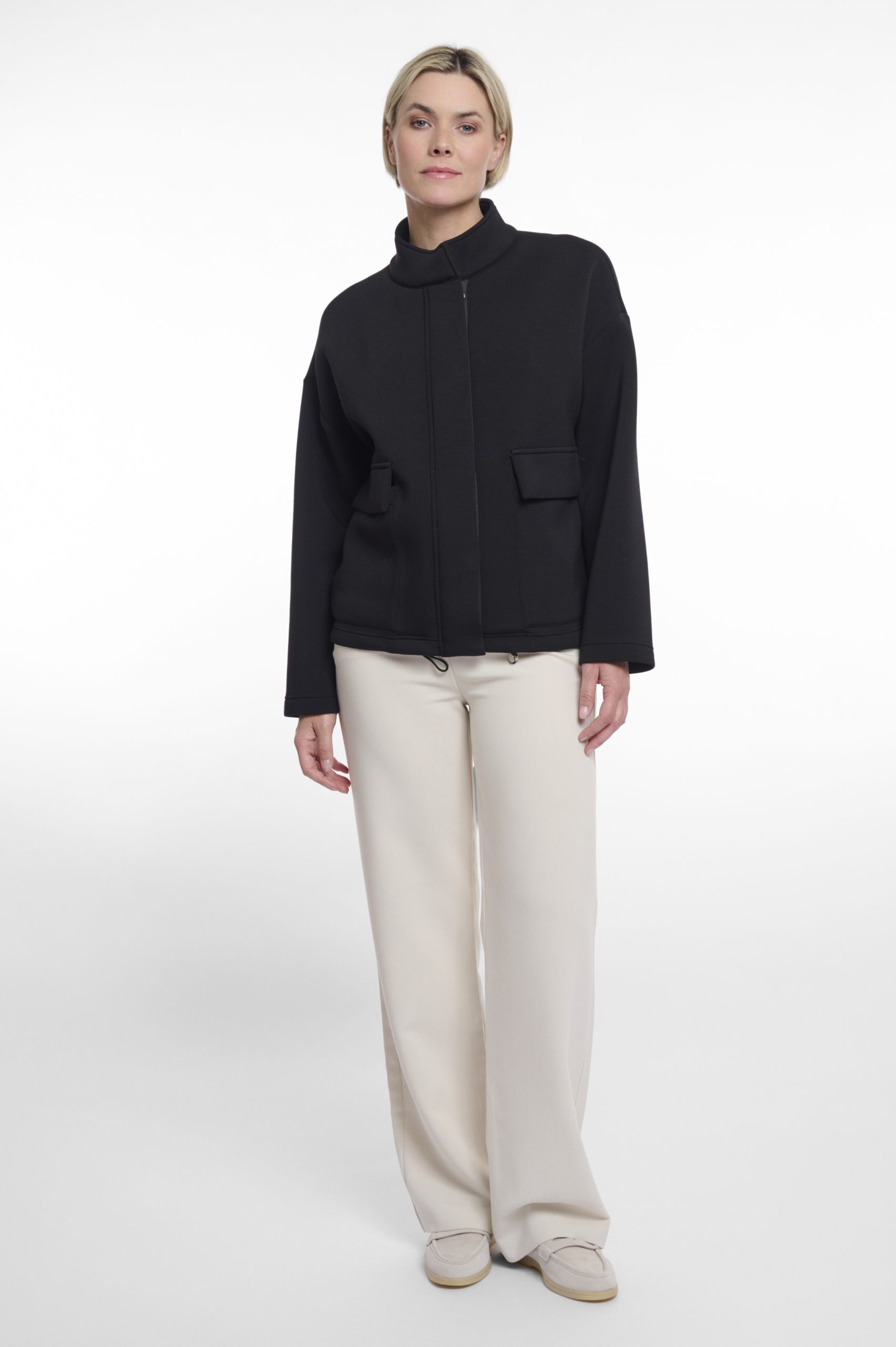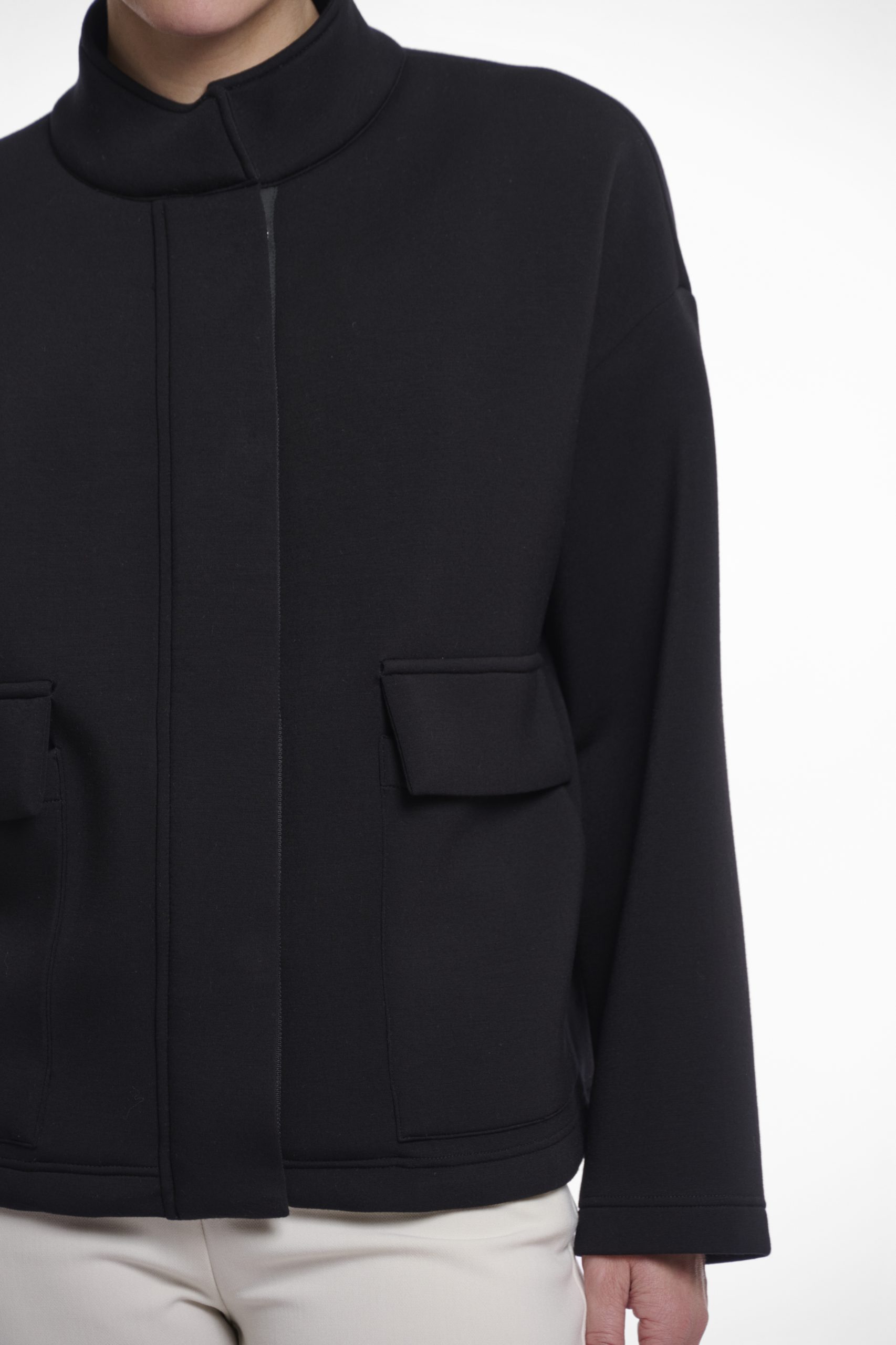 Giacca in materiale scuba con collo a coreana. Il capo presenta tasche anteriori, linea delle spalle bassa e coulisse in vita per una vestibilità personalizzabile.
